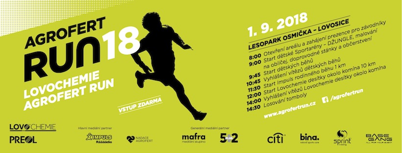 Společnost Lovochemie, a.s. vás zve na 4. ročník běžeckého seriálu AGROFERT run, který se koná v sobotu 1. září v lesoparku Osmička v Lovosicích.