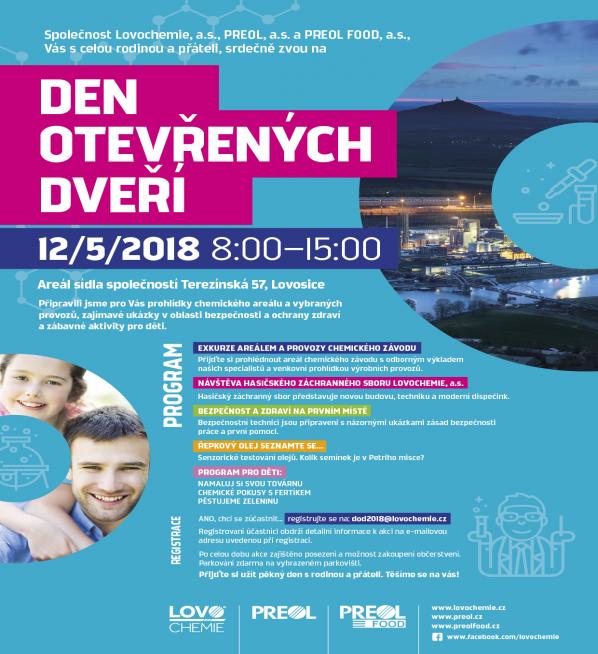 máte zájem nás navštívit a podívat se, co je u nás nového? 12. 5. Vám na akci Den otevřených dveří Lovochemie a PREOL 2018 nabízíme příležitost prohlídek chemického areálu, vybraných provozů společností Lovochemie a PREOL a řadu aktivit pro malé i velké návštěvníky. Z důvodu lepší organizace a bezpečnostních pravidel je pro Vaši návštěvu zřízen registrační mail dod2018@lovochemie.cz. Další informace k aktivitám, pravidlům akce a organizaci obdržíte na základě odeslaných registrací na uvedený kontaktní e-mail.