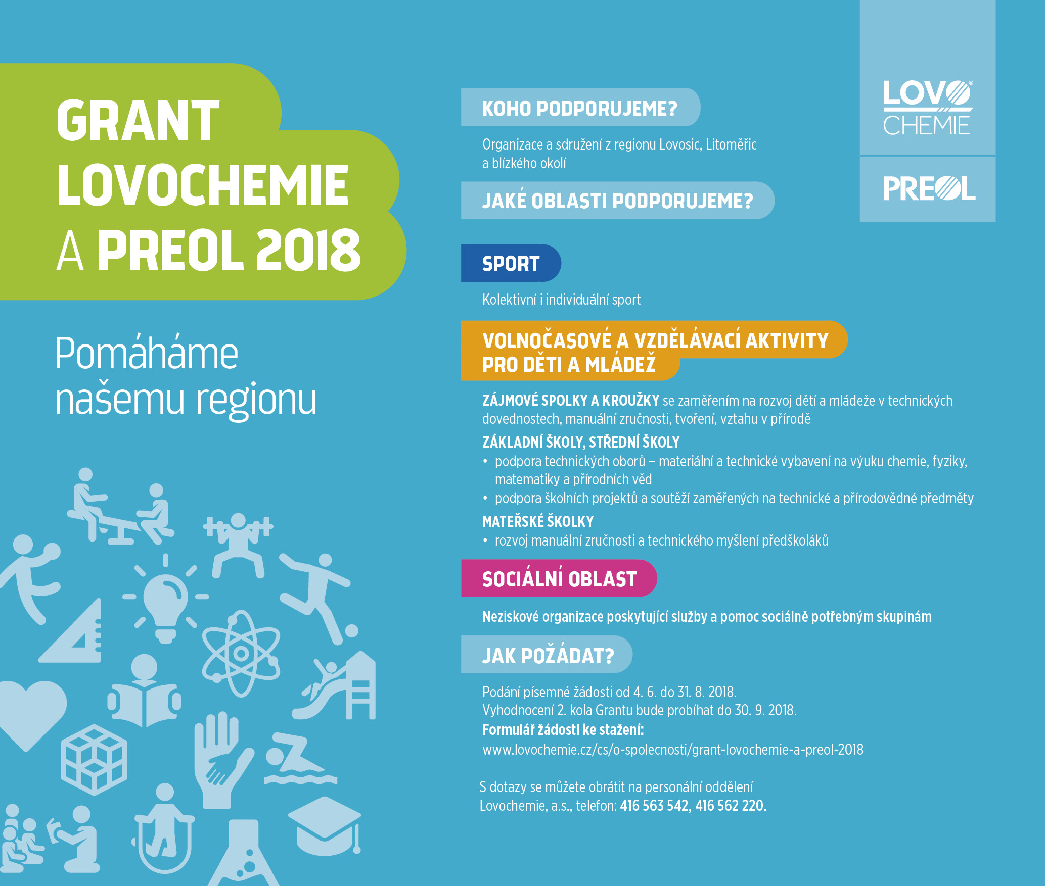 Od 4. 6. do 31. 8. opět přijímáme Vaše žádosti do Grantu Lovochemie a PREOL 2018 pro podporu organizací a spolků činných v oblasti sportu, volnočasových a vzdělávacích aktivit dětí a mládeže a v sociální oblasti.