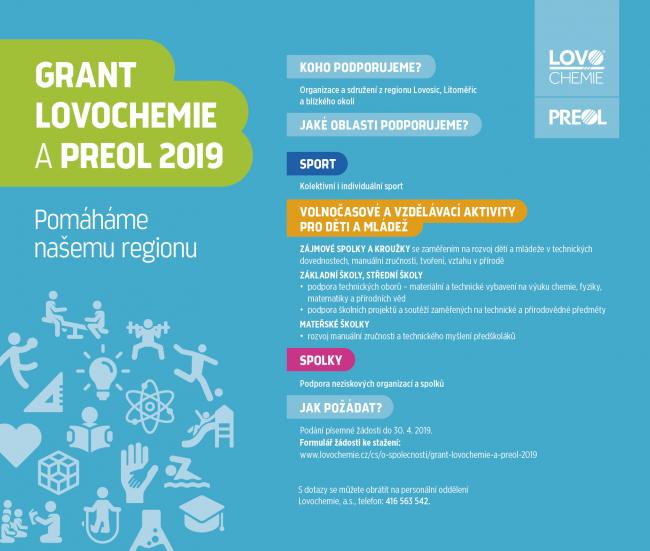 V roce 2019 opět přijímáme žádosti do Grantu Lovochemie a PREOL 2019 pro podporu organizací a zájmových spolků činných v oblasti sportu, volnočasových a vzdělávacích aktivit dětí a mládeže.