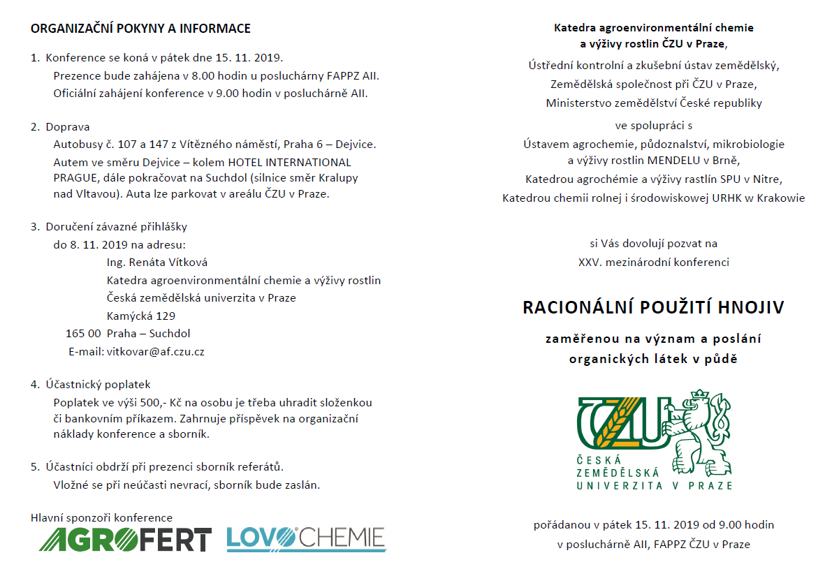 Lovochemie a.s. jako tradiční partner akce si Vás dovoluje pozvat na XXV.ročník mezinárodní konference RACIONÁLNÍ POUŽITÍ HNOJIV pořádanou v pátek 15. 11. 2019 od 9.00 hodin v posluchárně AII, FAPPZ ČZU v Praze.